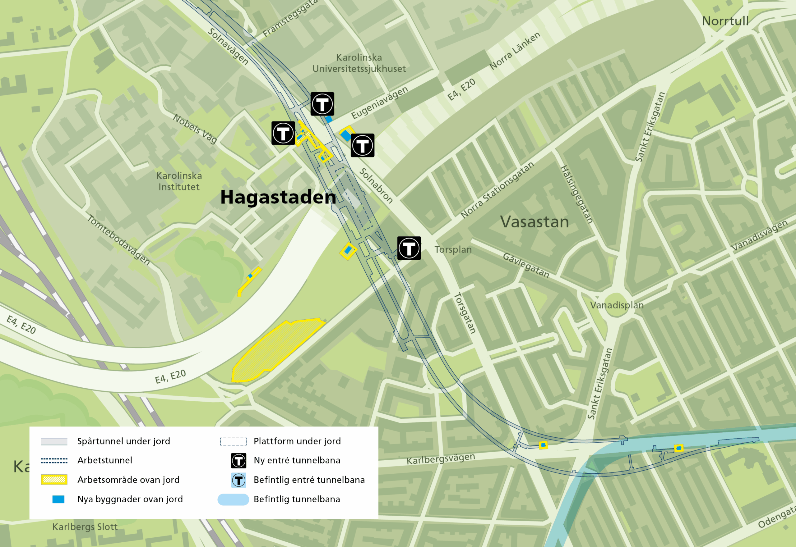 Vid Solnavägen byggs entréer mot Karolinska Universitetssjukhuset, Karolinska Institutet och Hagaplan.