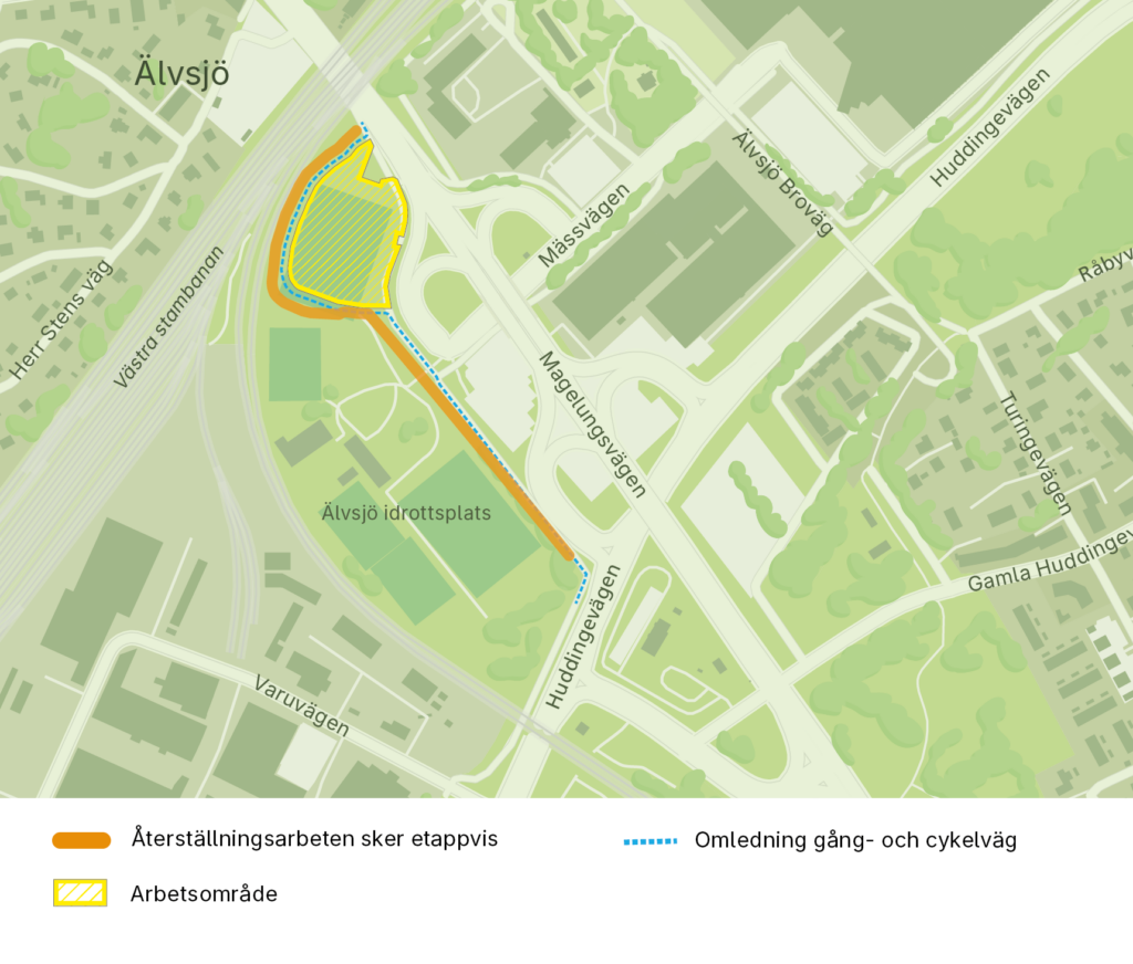 Vecka 16–18 utförs återställningsarbeten vid Älvsjö idrottsplats. Arbetet kan påverka framkomligheten för dig som cyklar och går igenom området.