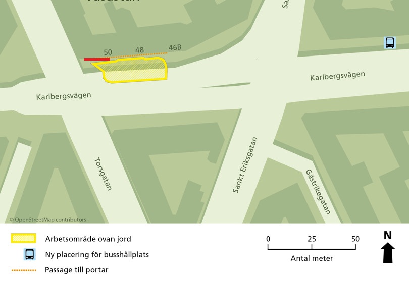 Från och med fredag 23 januari kommer gångvägen längs fasaden på Karlbergsvägen, mellan Torsgatan och Karlbergsvägen 50, stängas av tillfälligt när vi slutför arbeten med plattläggning inom arbetsområdet.