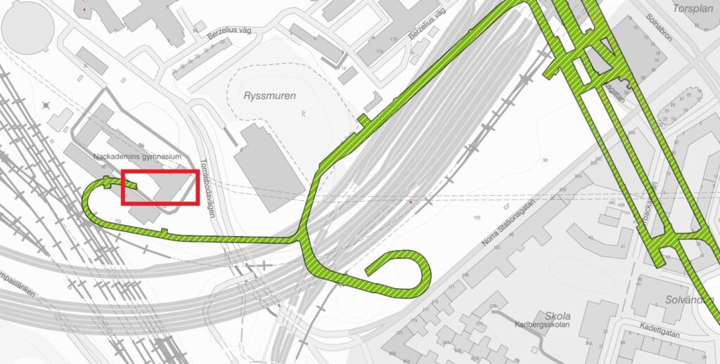 Arbetena kan periodvis orsaka stomljud i verksamheter nära tunneln inom det rödmarkerade området.