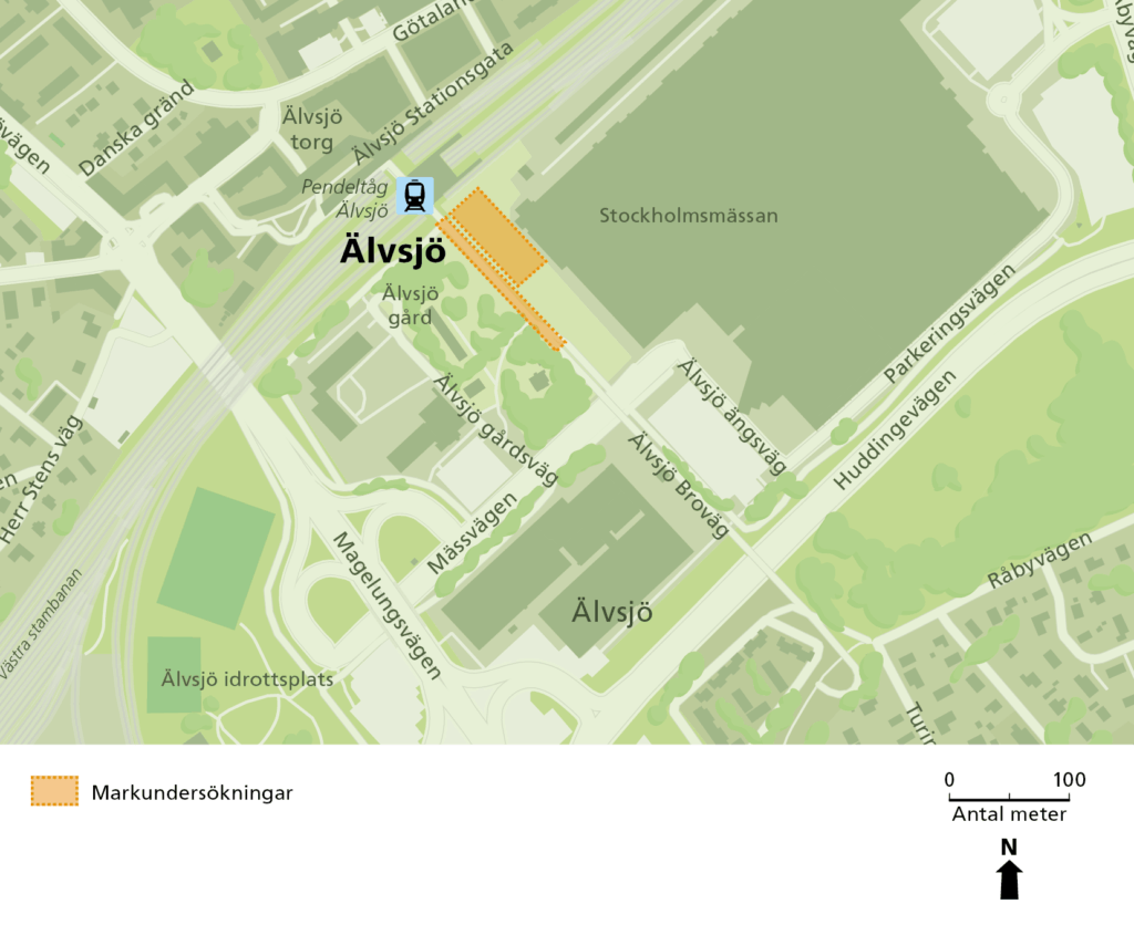 Plats: Borrning sker dels på Älvsjö Broväg (gång-cykelvägen), dels på en yta mellan Älvsjö Broväg och Stockholmsmässan. Se karta här intill.