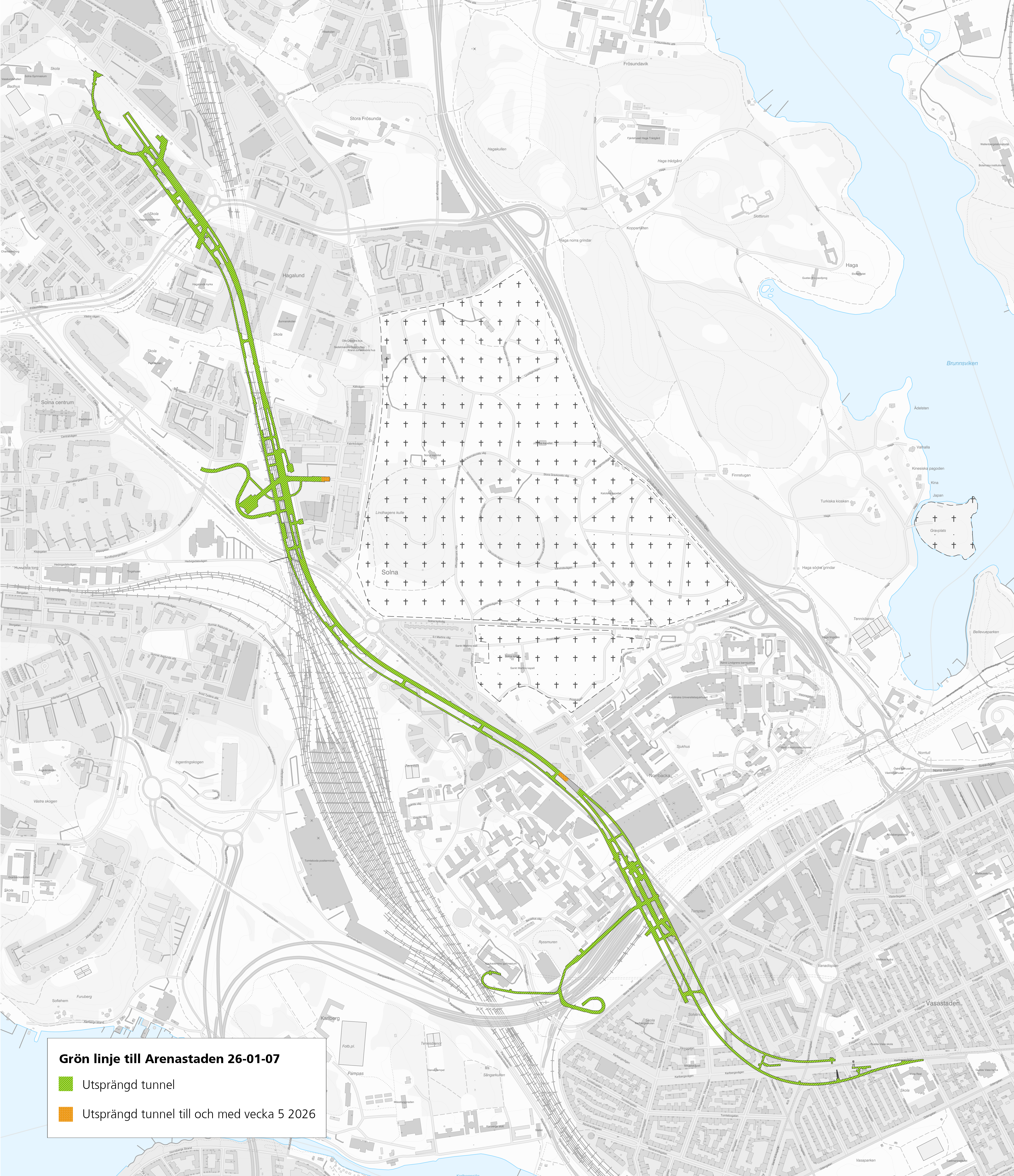 I Solna spränger vi tunnlar söderut mot Hagastaden. Tunnlarna befinner sig mellan Prostvägen och Solnavägen. Vi spränger också ut stationerna Södra Hagalund och Arenastadens rulltrappsschakt.