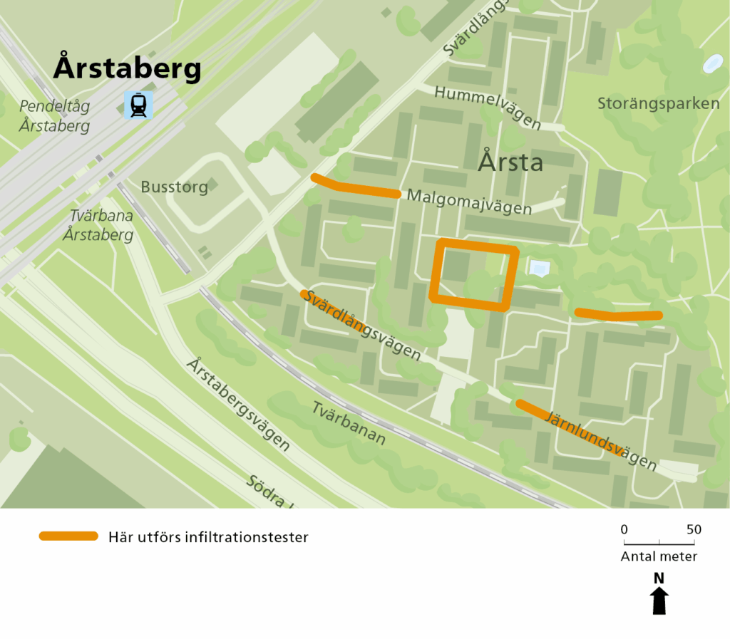 Vi arbetar etappvis på flera platser. Arbetsområdena stängslas in och det kommer att finnas skyltning och vägmarkeringar för dig som passerar. Arbetet innebär att vattenslangar dras vid gator och överkörningsskydd kommer därför att finnas.