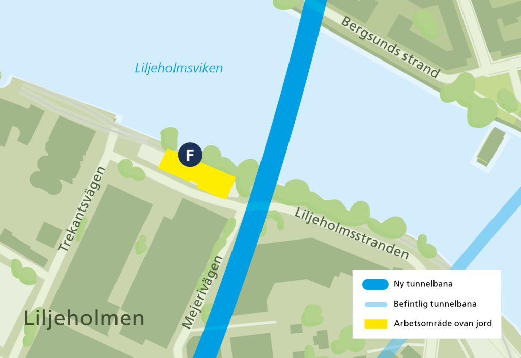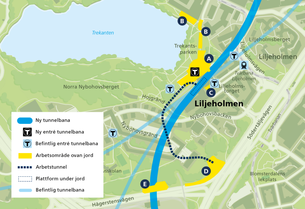 Tunnelbaneentrén mot Trekanten och trapporna från Liljeholmstorget planeras att stängas omkring årsskiftet 2026/2027 och öppnar igen när arbetena är klara. Arbets-området planeras att användas i cirka 9 år.