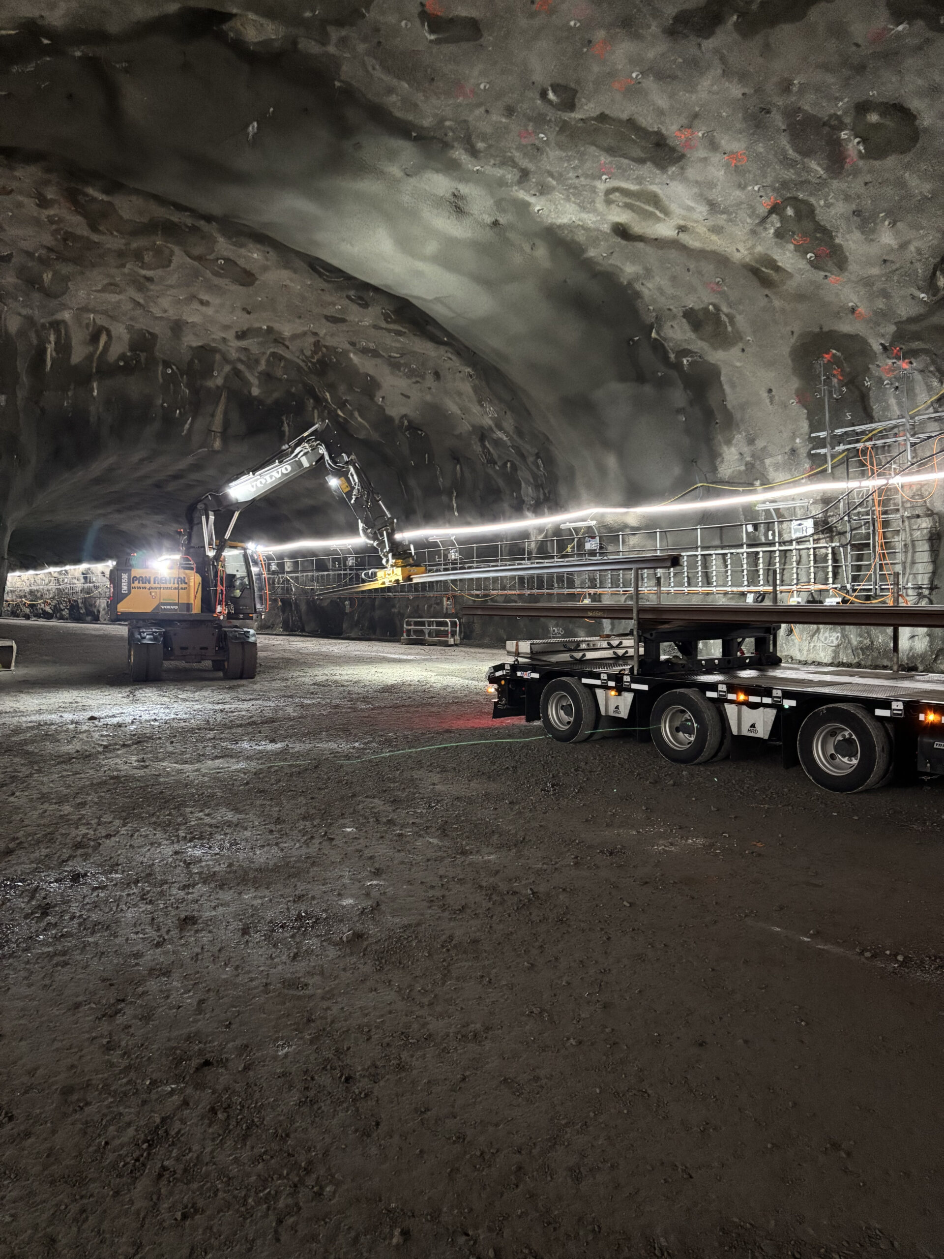 Rälsen levereras i 20 meter långa delar som transporteras genom staden och ner i tunneln. Innan leveransen provkörs sträckan för att säkerställa att transporten fungerar.