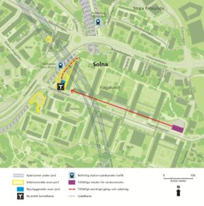 Vid Hagalundsgatan spränger vi ut det sista av berget för rulltrappsschaktet. I samband med sprängningen töms Tvärbanans hållplats Solna station en kort stund.